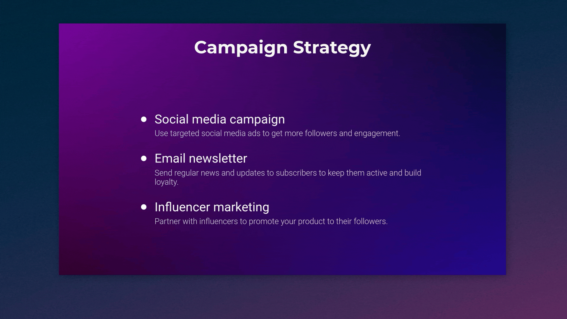 A bulleted list can fall flat if you rely simply on text. To keep your audience engaged, you can take more creative control of the slide background. To add some dimension to the slide, you might try an image or textured, gradient background. Just make sure you keep legibility in mind so your slide doesn’t go from boring to cluttered.