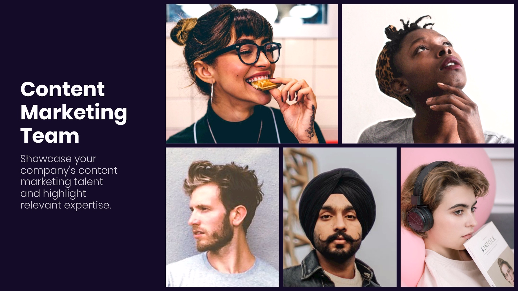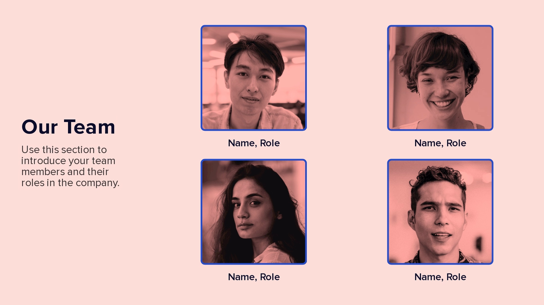 You can include team slides in a variety of presentations, including introducing investors to your leadership team, onboarding new employees, sharing existing clients to new prospects, or showcasing your team's expertise to external partners.