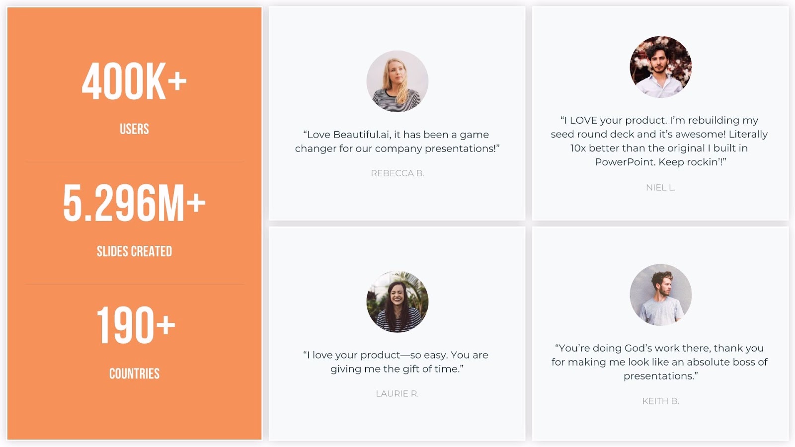 If you’re looking for a quotes slide, the photo grid template is a good hack. Each grid can feature quotes or feedback from users, and can even include company logos or customer photos, which you can present internally or to investors.