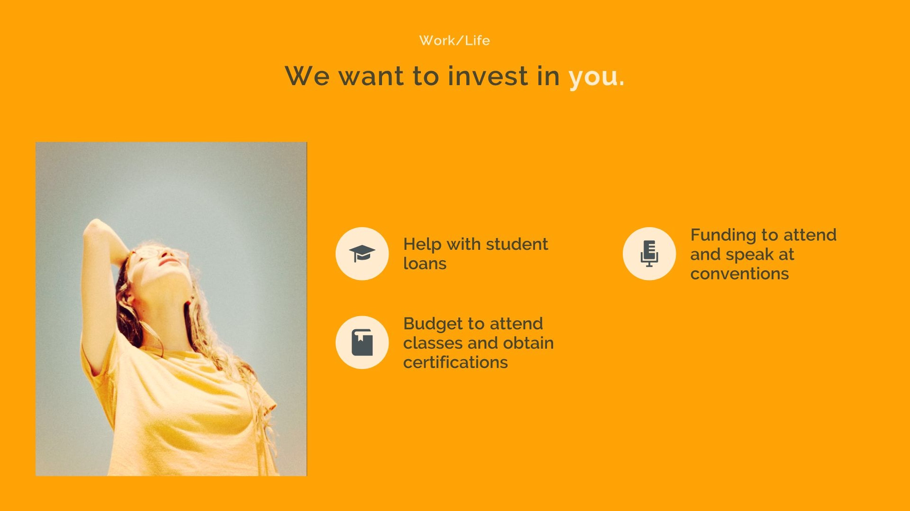 This is where you cross over into dollars paid on top of base salary. Companies who have the most competitive compensation programs boast medium to high compensation ranges, as well as equity options, incentive and bonus programs and generous retirement options. Similar to slide 3, this carousel slide will list what is offered and sets the stage for more details later on.