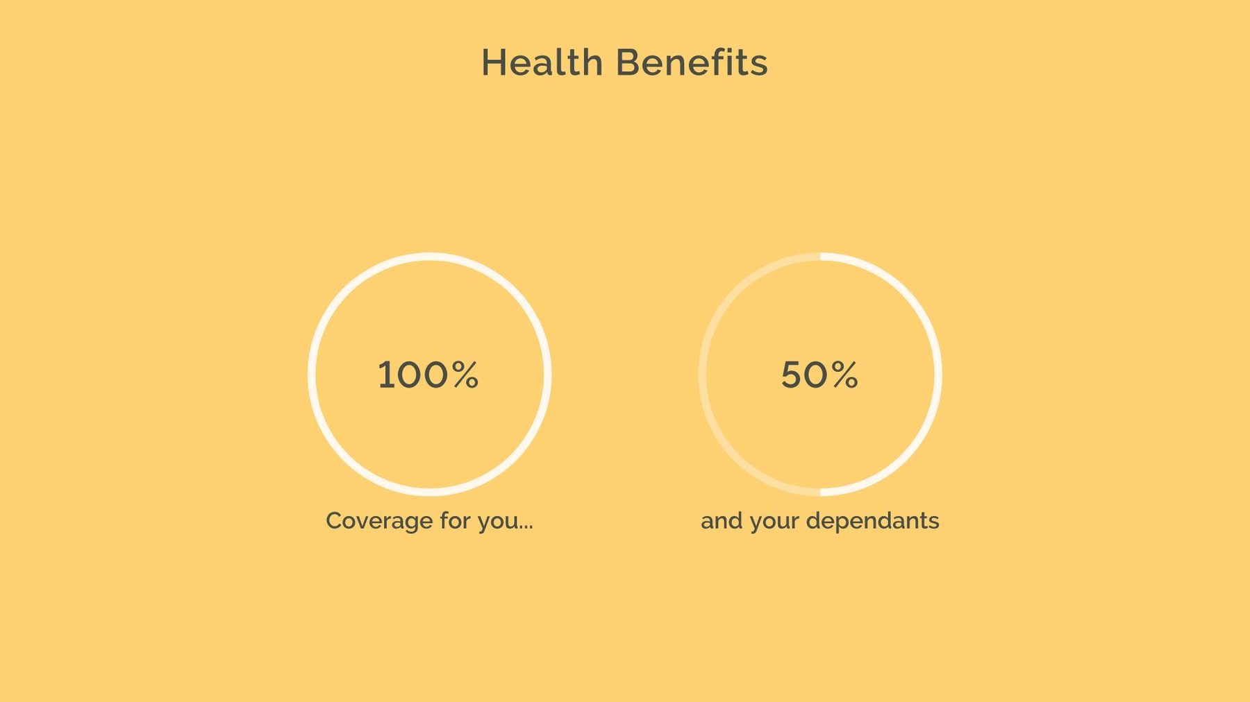 Health Benefits are what your audience is here for. They want to know what they are and how much they have to pay for them. Here is a good opportunity to use a creatively designed data comparison slide to show coverage. Then use a carousel slide to go into traditional health benefits including medical, dental, and vision. These are the core offerings and most (if not all) employers provide some sort of premium coverage.