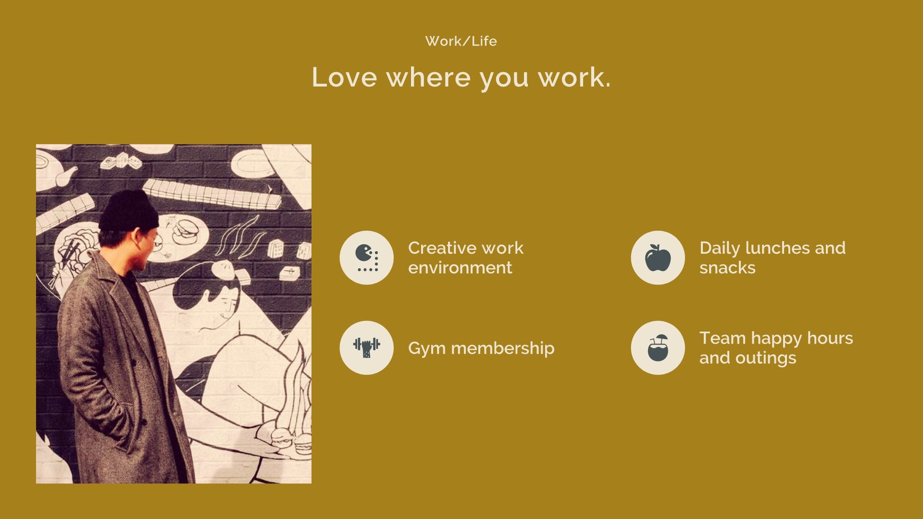 In this case, and in most cases, a picture is worth a thousand words. Rather than just writing a bullet point list of cultural and team benefits, show them! Include pictures from team events, outings, and activities. You can also use various filters for these photos, including colorful ones specific to your official company colors.