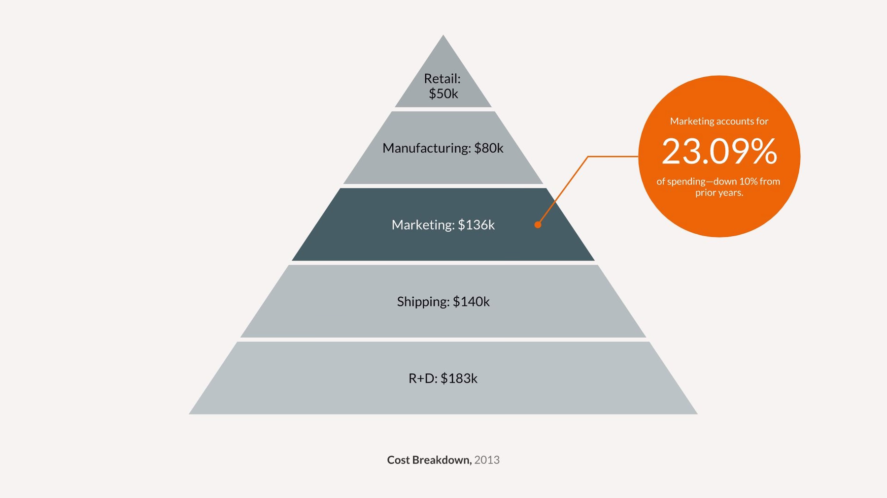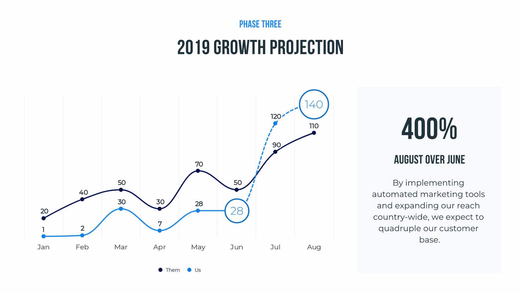 Within each chart or graph template you have the option to change the chart style or settings with a simple click. You can unlock adjustments such as “emphasized” sections, diagram size and shapes, or colors. A more specific example is that you can opt to change a section of your graph to "projection", which shows your growth up until that point and projected growth for the remainder of the year, on one slide.