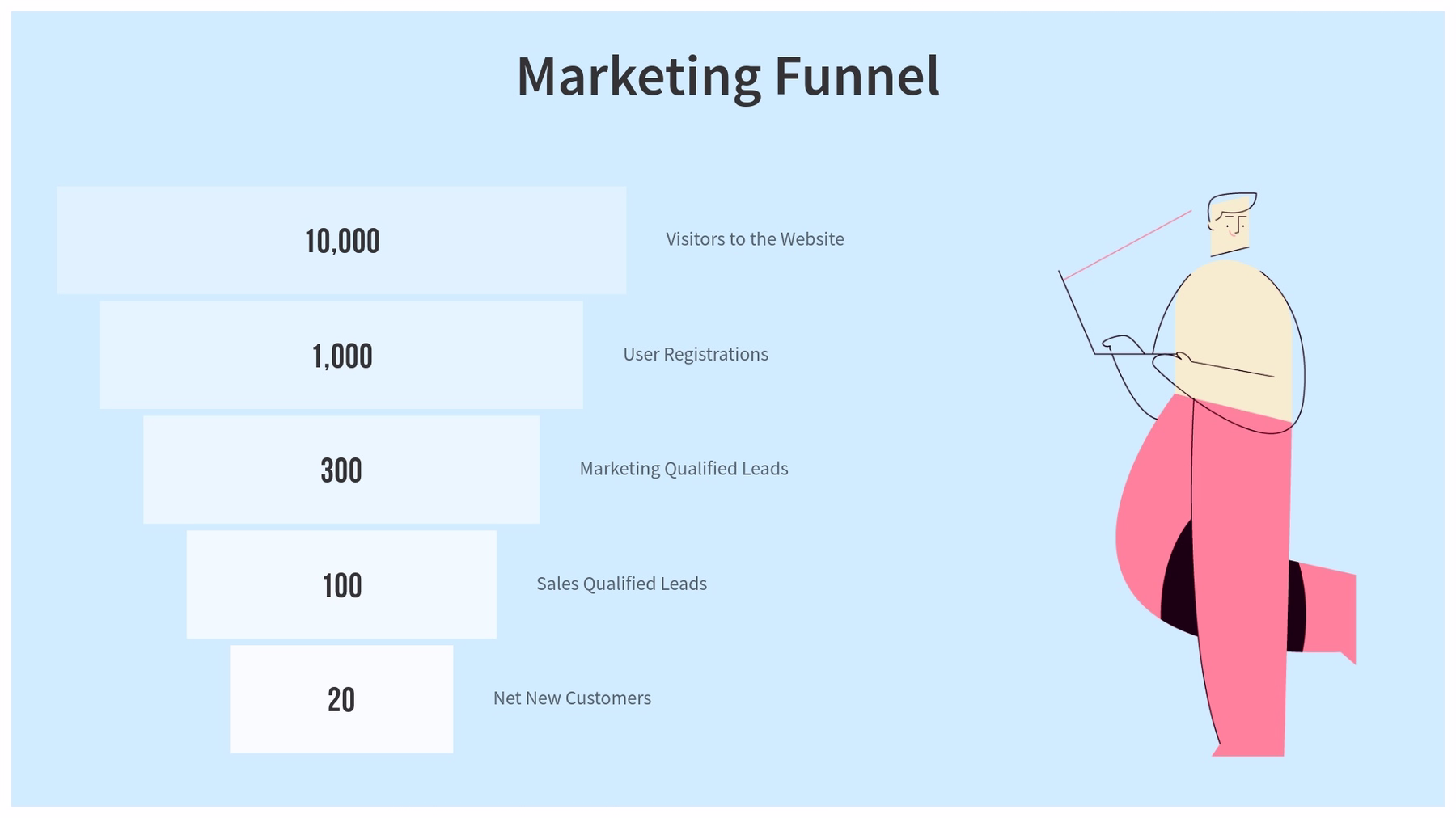 A funnel chart is an incredibly versatile diagram that illustrates the stages of a process in the workplace. People often use funnel slides in presentations to summarize data, track sales conversion and retention rates, or identify where a process breaks down. It’s a great chart for sales and marketing teams, but the use cases are endless.