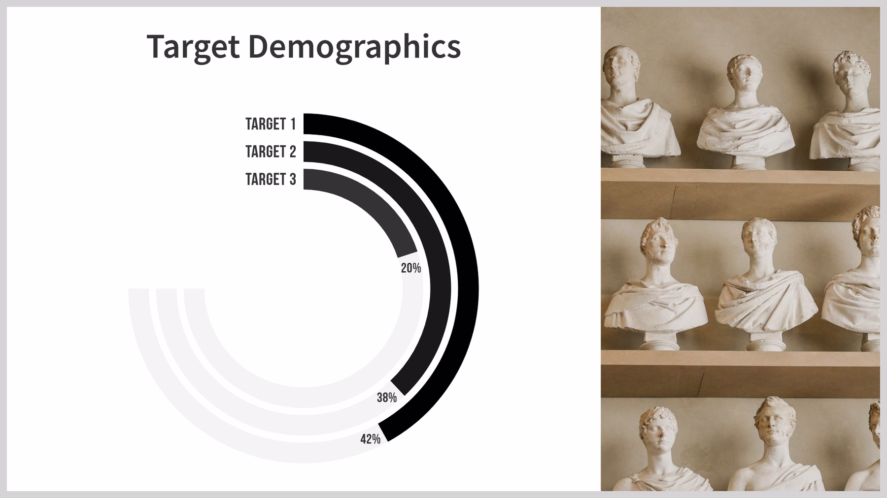 Need to add a little visual interest to your business presentation? A radial bar graph slide can display your data easily and effectively. The radial bar graph is a good option if you’re looking to mix things up from a traditional vertical or horizontal bar. Customize our radial bar graph template to compare data over time, show relationships between two different groups, or call out patterns or trends in data.