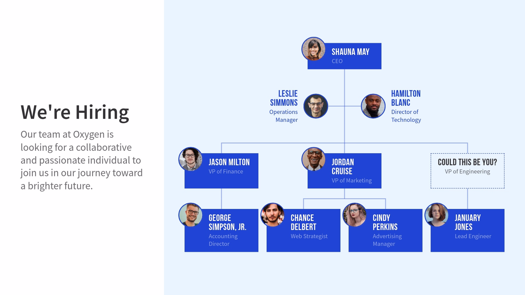 A team slide is a visual depiction of the members of your team. It should have photos, names, job titles, and can even include short bios or credentials. You can use team slides in a variety of presentations, including: introducing investors to your leadership team, onboarding new employees, or showcasing your team's expertise to prospects.