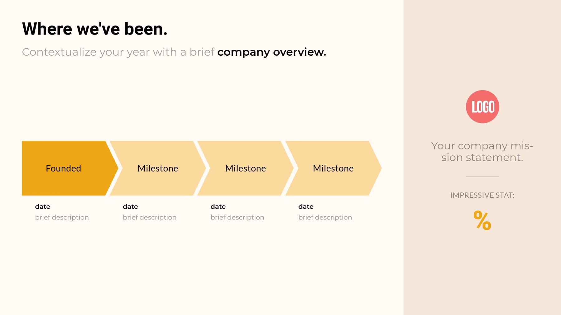 To remove some of the guesswork, and give you an easy starting point, we created a customizable end of year business review presentation template. This is the foundation of your presentation. Curated by industry experts, the pre-built template has the key components of a year end business review that you can quickly edit and tailor to fit your story. As you make it your own, keep the following slides in mind for the most effective end of year review deck.