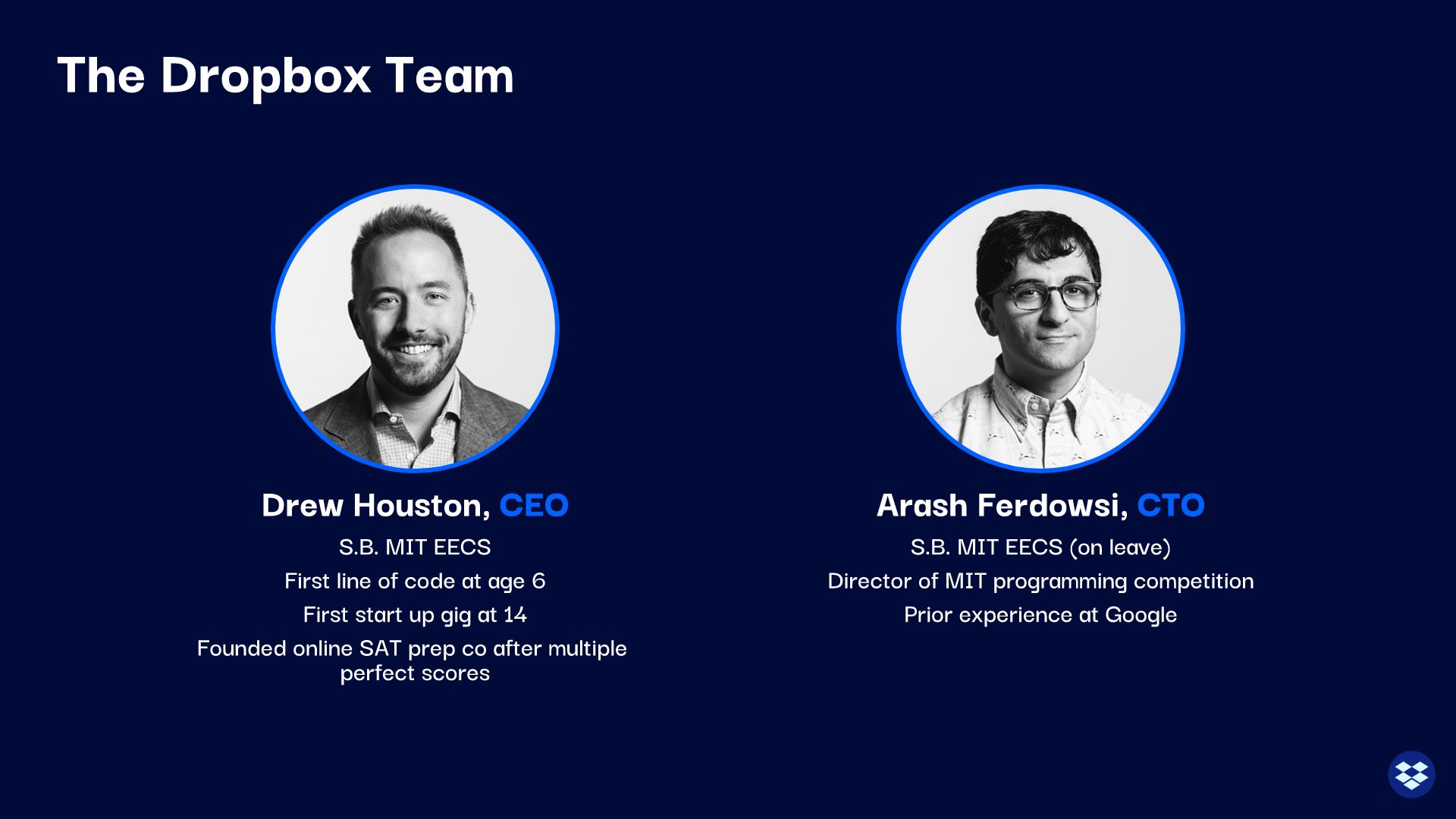 Any effective pitch deck is going to introduce potential investors to the startup’s principal stakeholders. The original Dropbox pitch deck displayed a photo of the company’s CEO and CTO, along with a brief explanation of each of their backgrounds. We transformed this slide in our redesign, by placing more professional images of each executive atop a bold background color. Beautiful.ai’s team members slide template is the real MVP here.