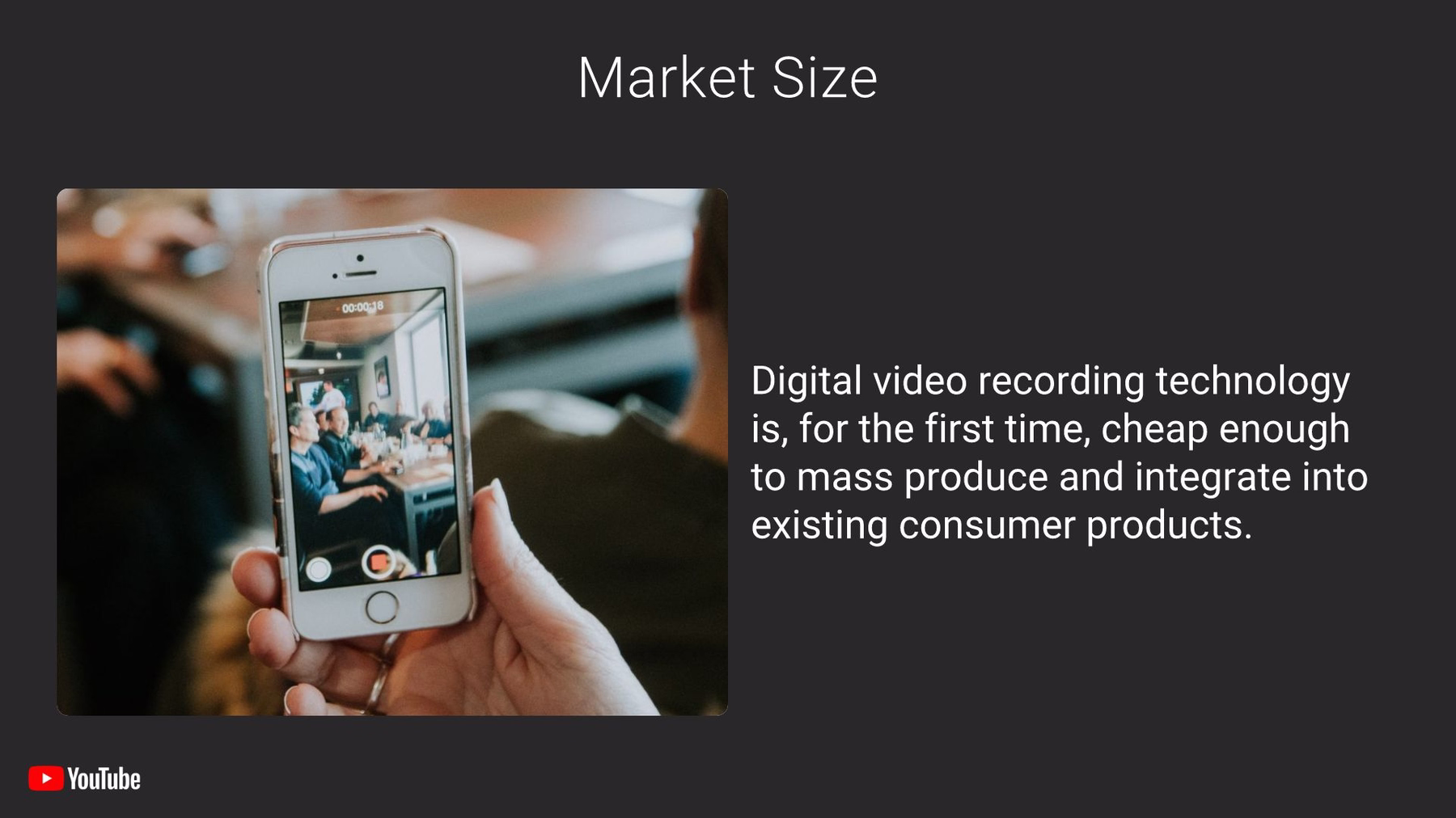 We would hate for investors to get bored, so we changed up the next slide with a black background. To detail the potential market for the 2005 YouTube, we chose a carousel slide that allowed us to split the info from the original into two sections, one appearing after the other. How much more interesting is our slide with engaging photos alongside the information?