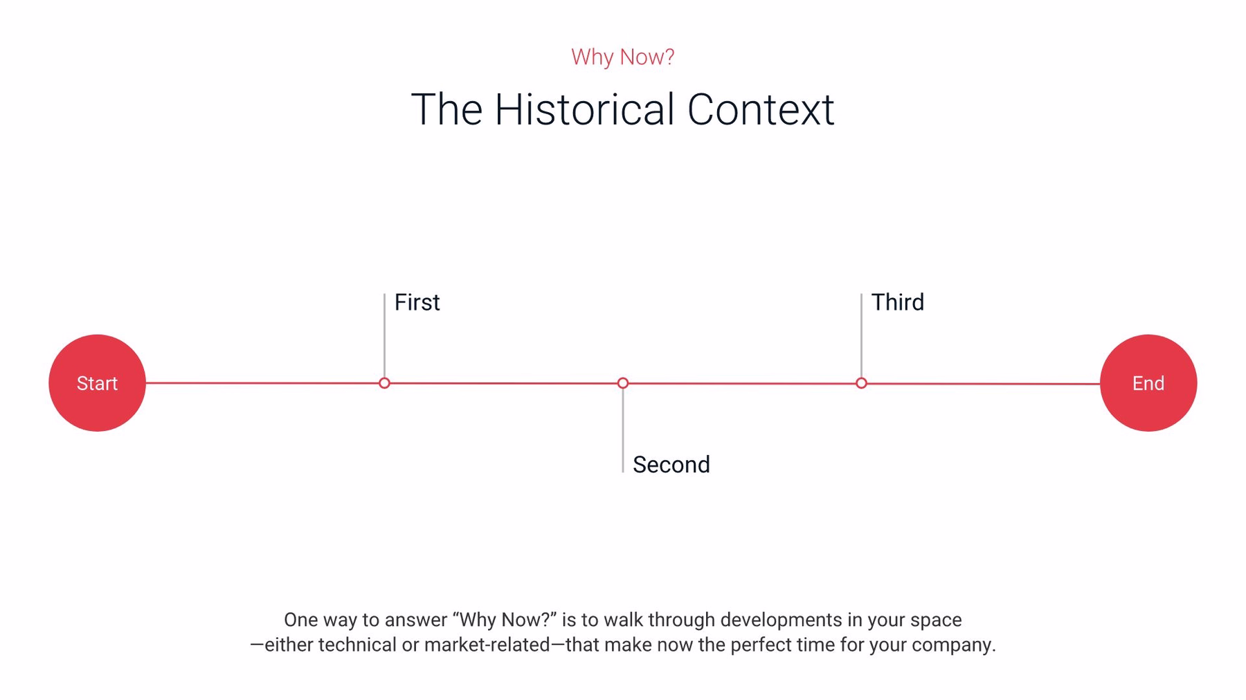 The future is important, but so is the present. Use this slide to address your current business situation, what the immediate future holds, and your plans for any capital raised right now. The timeline or process slides can help you effectively communicate exciting next steps for your business. This is also a slide where you need to really think about how to condense information into what’s most important. Your investors will be at the tail-end of their 20-minute presentation, and you want to make sure you go out with a bang.