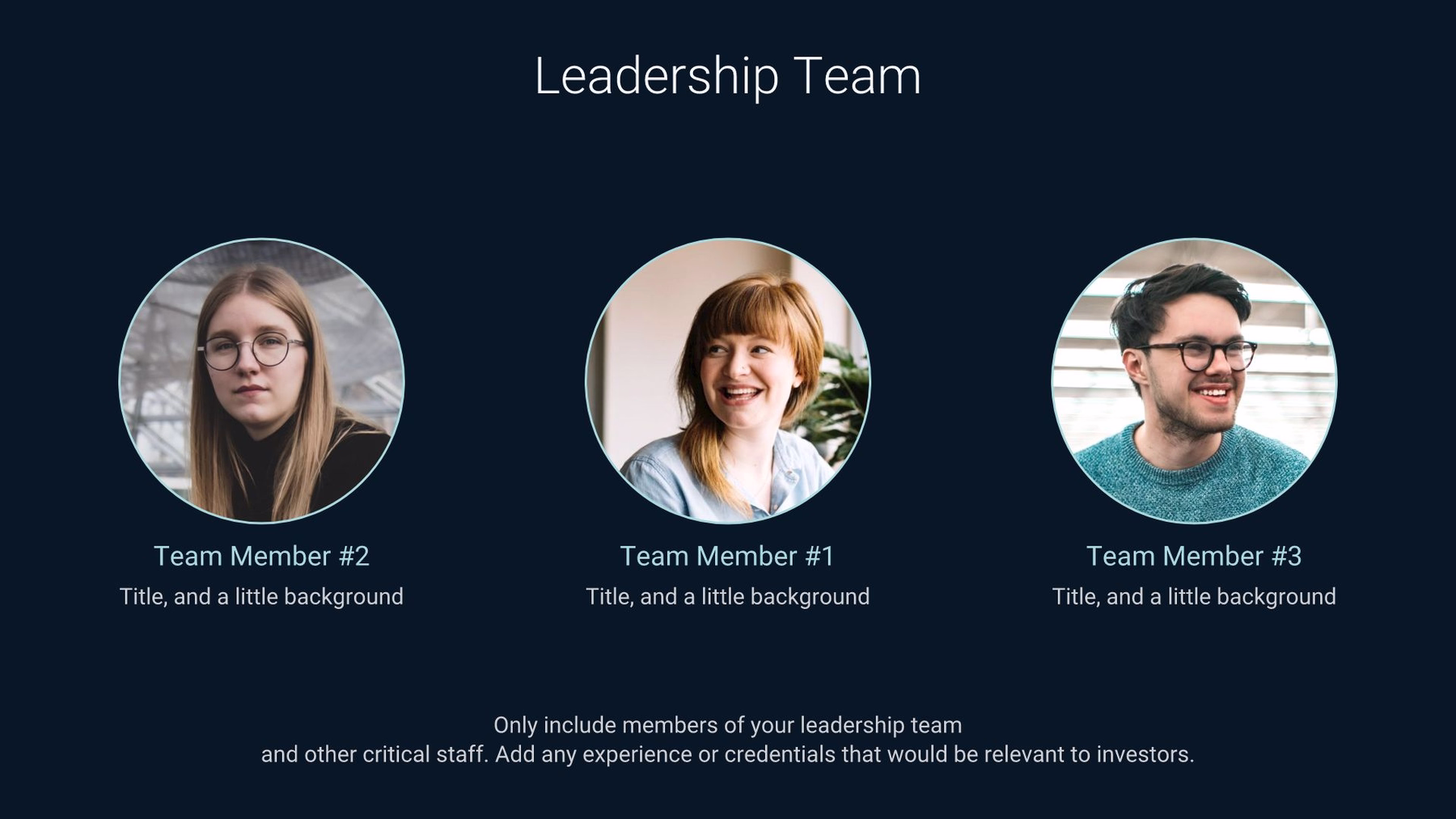 Potential investors want to know about the key players on your team. Use the team slide or about us slide to help them understand your biggest asset: your people.
