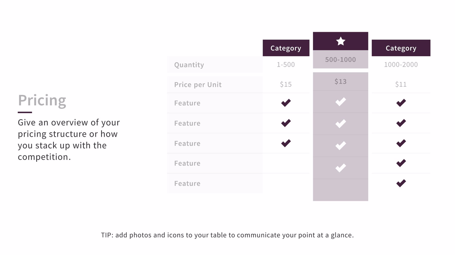 Now, put your money where your mouth is (literally and figuratively). If you talk about pricing, it's important to put these slides at the end of your presentation. Your prospect needs to hear your story before they can be convinced that your product or service is worth the cost.