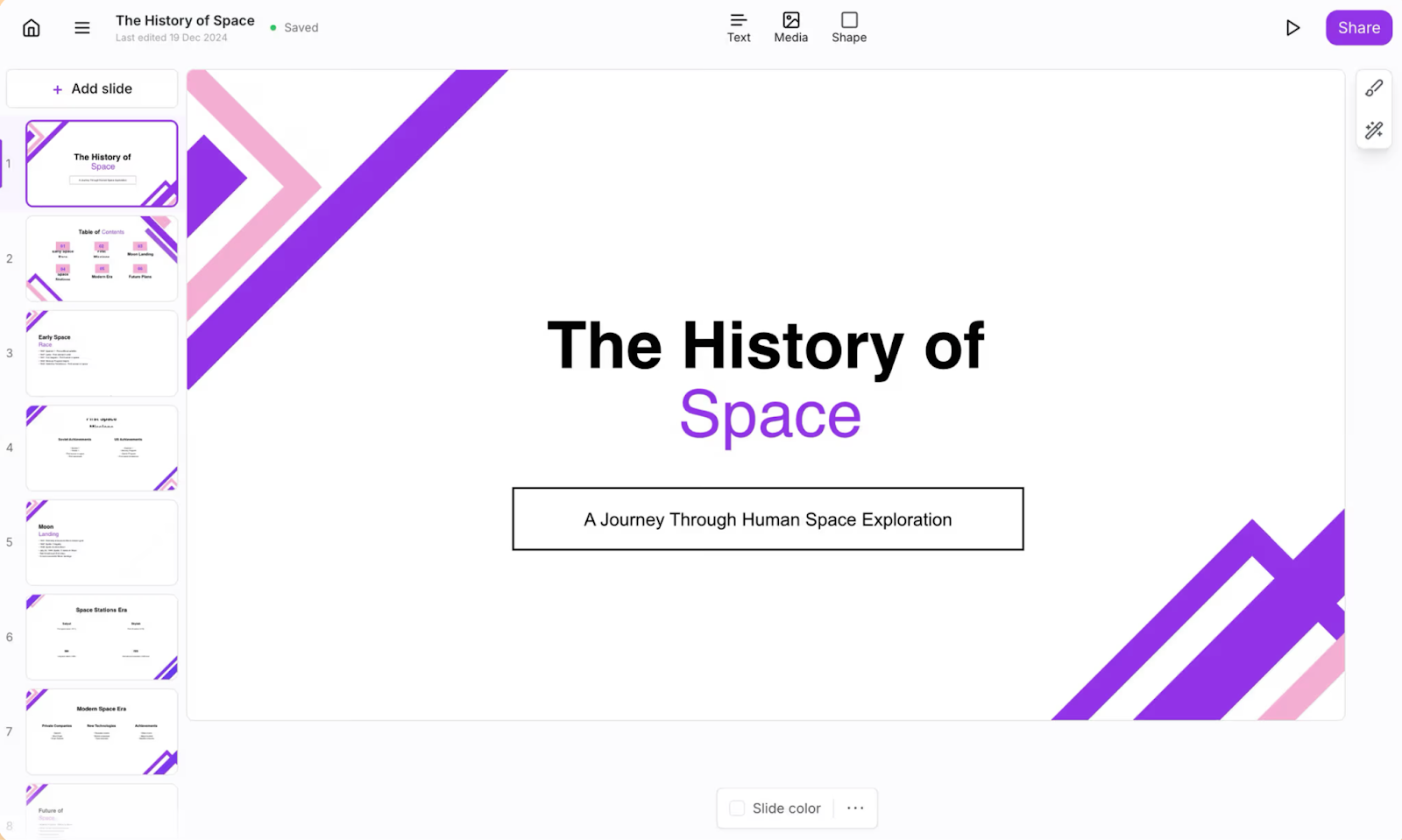 Slidebean supports animations, standard export formats, and simple workspace organization. While it offers less granular control than PowerPoint, its automation-first approach appeals to users who want professional presentations quickly, without heavy editing.